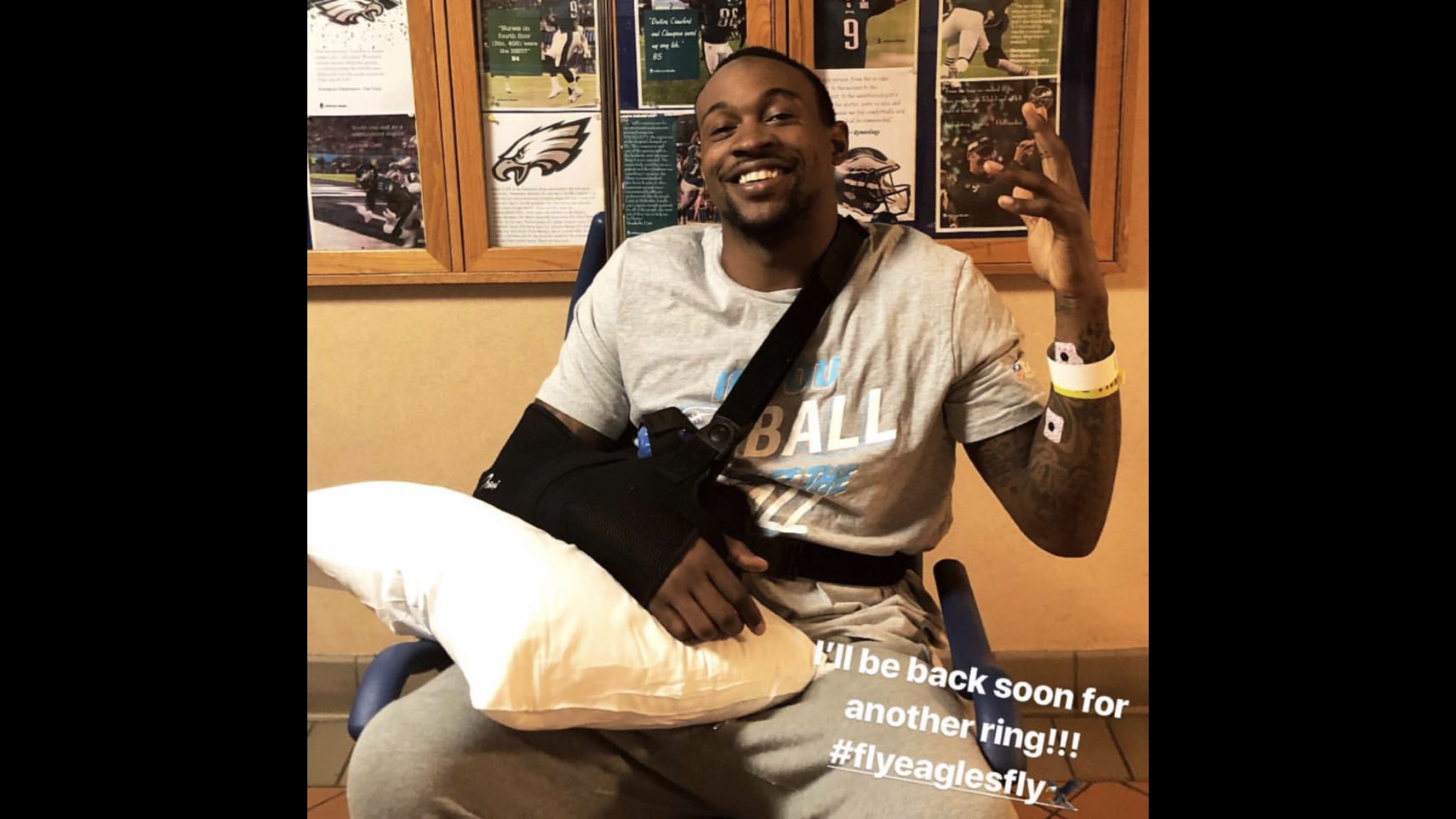 A photo of Jeffrey was posted on Twitter, after his surgery, with a message from him for the fans, “I’ll be back soon for another ring!!! #flyeaglesfly.“
